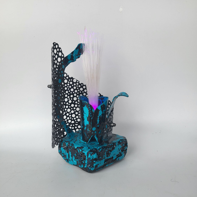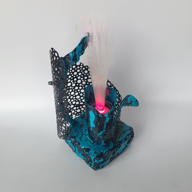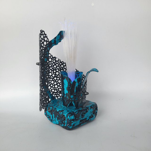 Ce luminaire en fibre optique est une pièce artistique contemporaine. Il se compose d'une base texturée bleu turquoise et noir sur laquelle repose une structure métallique noire ajourée de motifs circulaires, rehaussée de touches turquoise. Un faisceau de fibres optiques blanches émerge du centre, illuminé par une lumière bleue à sa base, créant un contraste visuel moderne et original.