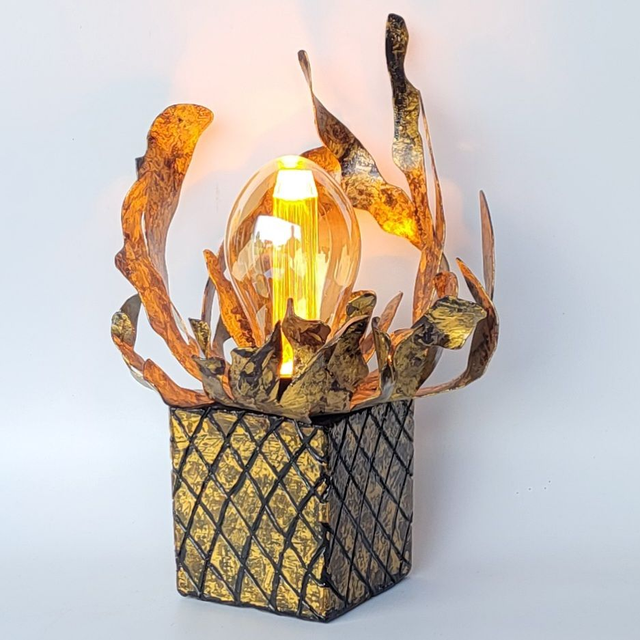 La Sculpture Métallique : De ce socle s'élance une structure en métal découpé, probablement au plasma, qui enveloppe la source lumineuse comme une corolle sauvage ou des flammes d'acier. Les formes sont organiques, irrégulières et nervurées, avec une finition dorée chaude qui capte intensément la lumière.