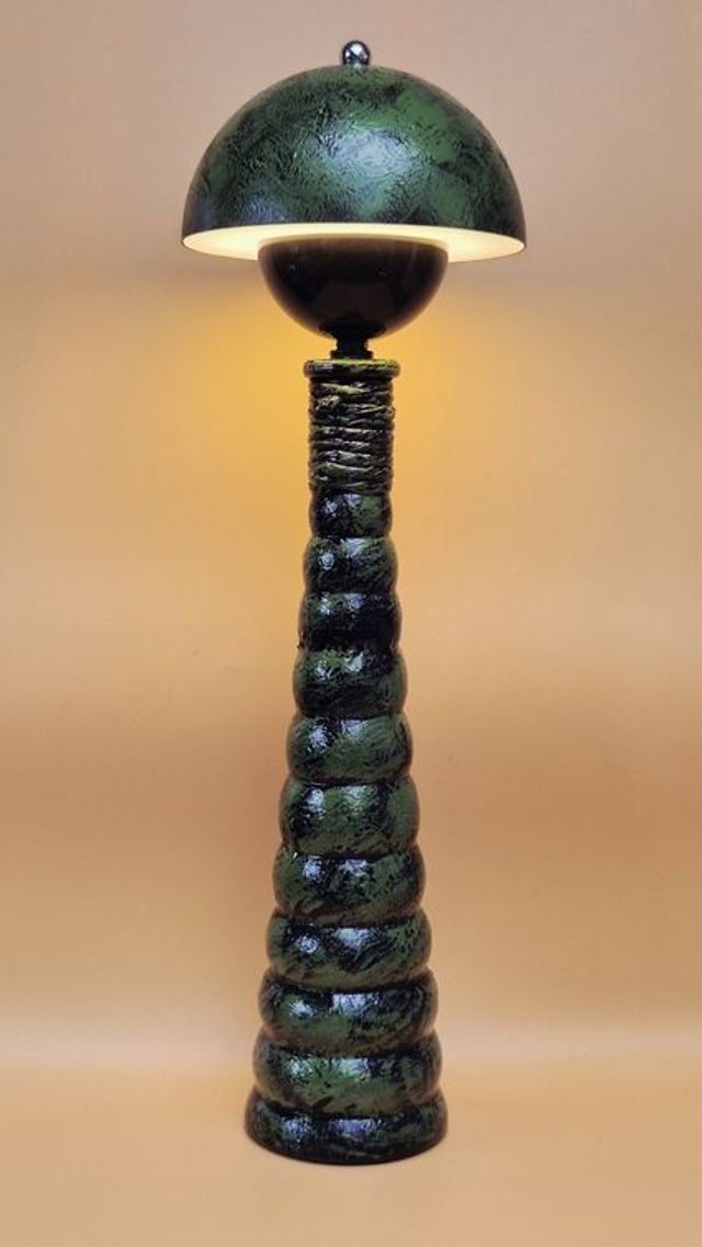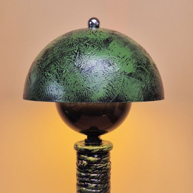 Ce luminaire est une pièce de design qui allie une esthétique organique à une allure presque futuriste. Sa finition vert émeraude, aux reflets mouchetés et sombres, lui confère un aspect précieux. Sans fil et rechargeable via USB, cet objet nomade s'affranchit des contraintes électriques pour devenir une véritable sculpture lumineuse que l'on déplace au gré de ses envies.