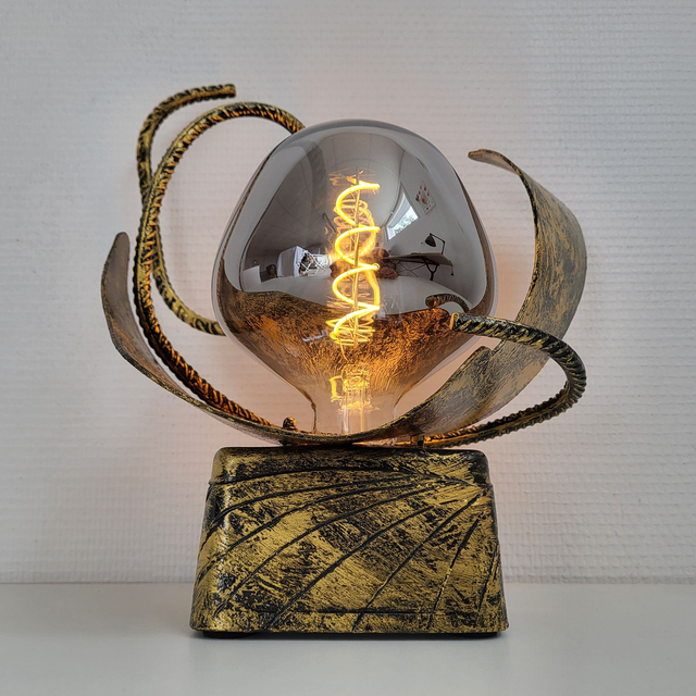 De cette base robuste s'élancent des structures métalliques aux courbes fluides : d'un côté, des tiges torsadées évoquant des lianes ou du fer à béton détourné, et de l'autre, de larges feuilles de métal martelées qui semblent protéger le cœur lumineux. La peinture artistique dorée vient souligner les reliefs, jouant avec les reflets de la lumière.