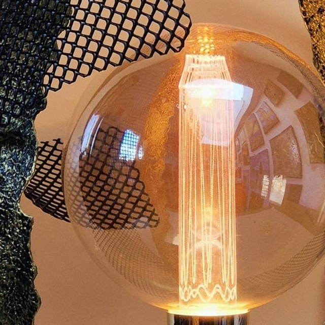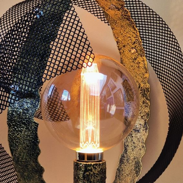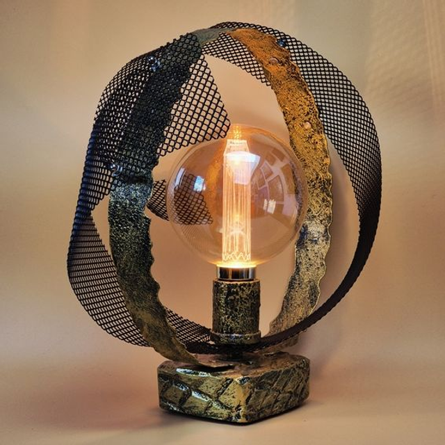 Ce luminaire artistique se définit par un équilibre visuel entre la force minérale de son socle en béton fibré et la légèreté de sa structure aérienne. Des anneaux de métal texturé aux reflets dorés et des voiles de grille perforée s'enroulent dans un mouvement orbital autour d'une ampoule globe LED centrale. L'ensemble évoque un mécanisme d'astronomie ancienne ou un astre en formation, créant un jeu d'ombres et de lumières fascinant qui transforme l'éclairage en une véritable expérience sculpturale et mystique.