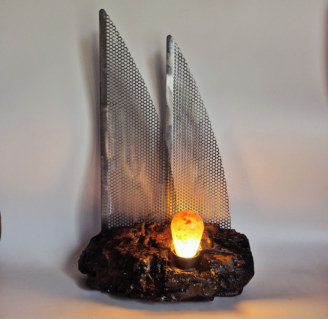 Ce voilier décoratif associe un socle en bois, deux voiles en métal perforé et une lampe de sel diffusant une lumière chaude. L’ensemble crée une pièce artistique mêlant style naturel, industriel et ambiance chaleureuse. 27x40 cm