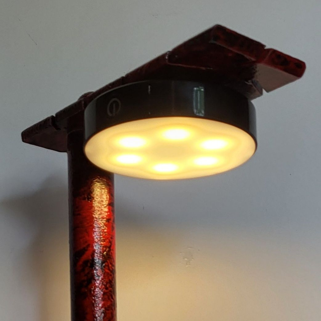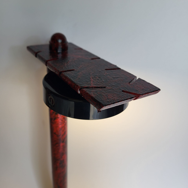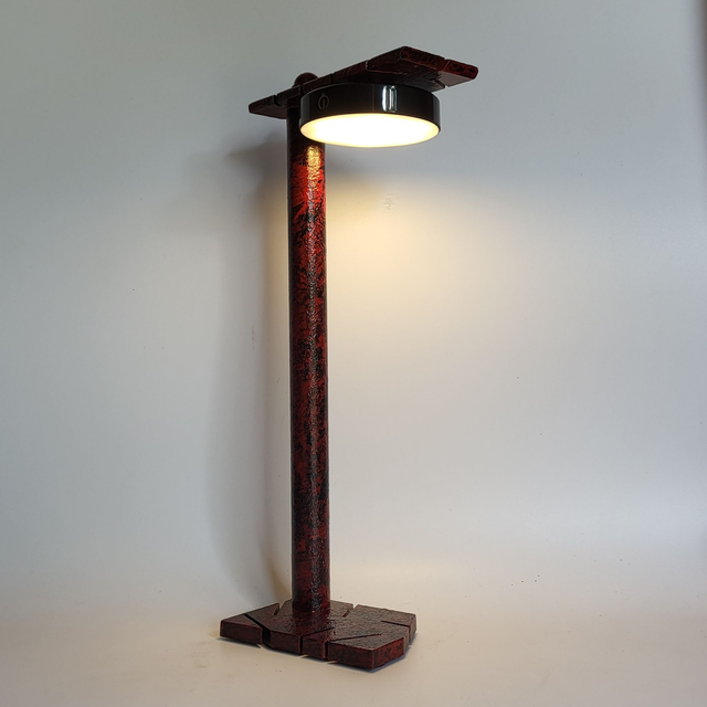 Ce luminaire est une lampe sur pied au design moderne, avec une colonne et une base en métal rouge foncé, texturé. La lumière émane d'un diffuseur rond noir et blanc, offrant un éclairage chaud et dirigé. Son aspect suggère une fabrication robuste et un fini artisanal. Il est conçu pour être rechargeable via USB, accentuant sa portabilité. Ce luminaire combine esthétique unique et fonctionnalité pratique.