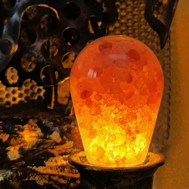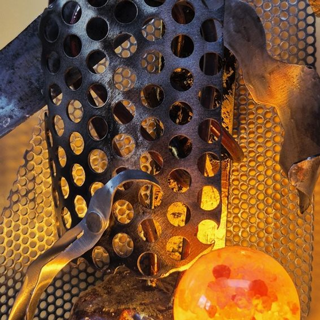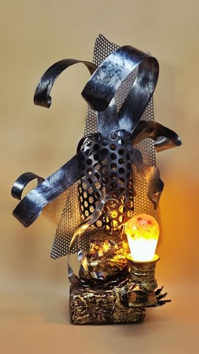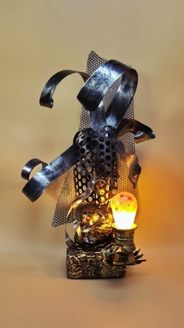 Ce luminaire sculptural allie la force brute d'un socle en béton fibré à une structure aérienne composée de rubans métalliques courbés et de grilles perforées. L'ensemble est mis en valeur par une ampoule de sel qui diffuse une lumière orangée apaisante, créant un contraste saisissant entre l'esthétique industrielle du métal brossé et la douceur minérale. H 44 cm