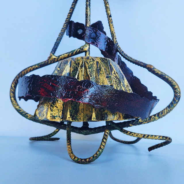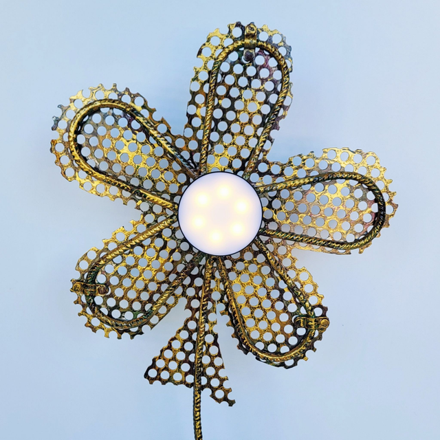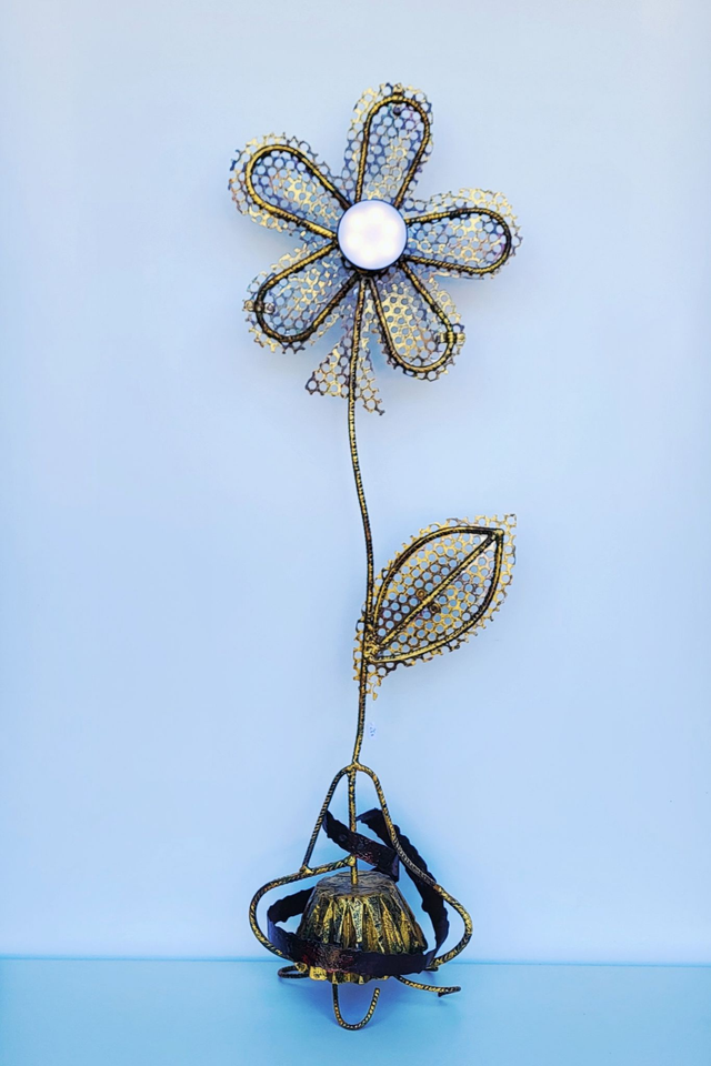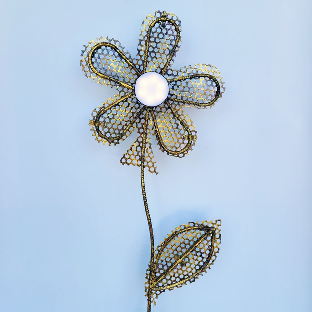 Le luminaire représente une fleur stylisée avec un design aéré et délicat. Le centre de la fleur est orné de points lumineux qui diffuse une lumière douce, recharge USB l'ensemble supporté par un aimant. Les pétales sont réalisés avec un treillis métallique doré et noir, créant un motif ajouré. La tige fine et une feuille unique reprennent le même style. La base, d'où part la tige, est travaillée avec des volutes métalliques sombres, ajoutant une touche artistique à l'ensemble. 115 cm