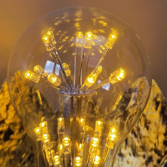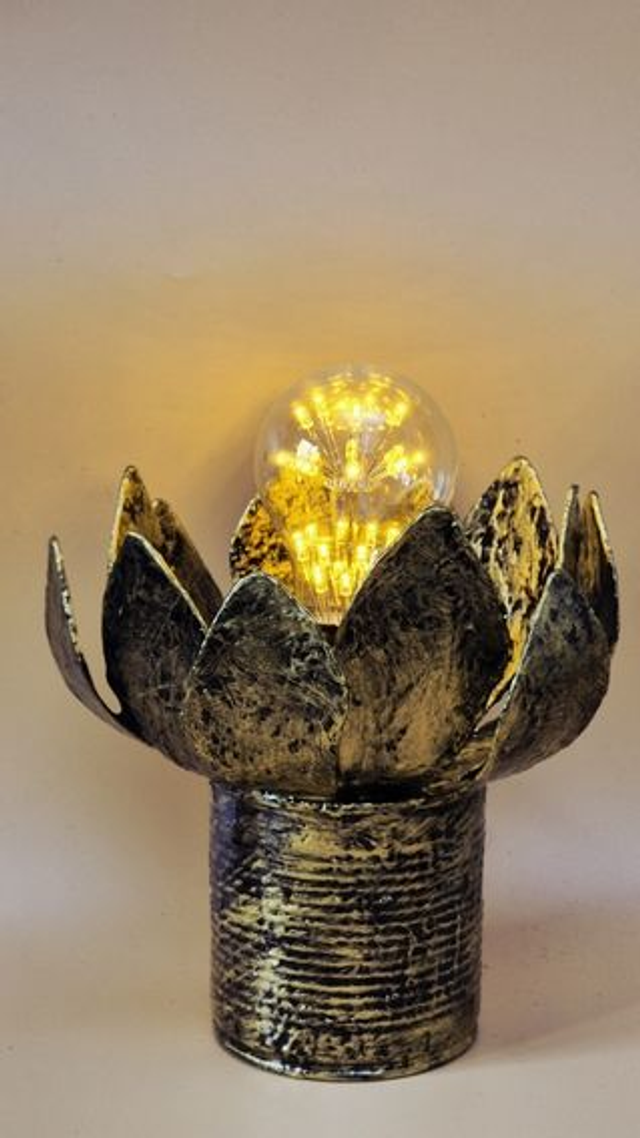 Ce luminaire se distingue par son style artisanal et floral, évoquant l'éclosion d'une fleur de lotus ou d'une plante grasse en métal. Sa structure repose sur une base cylindrique surmontée d'une corolle de pétales évasés à la finition patinée noire et bronze doré, offrant un aspect antique et martelé. Au centre, une ampoule sphérique aux filaments LED scintillants diffuse une lumière étoilée qui se reflète sur les parois métalliques, créant une ambiance poétique et zen.