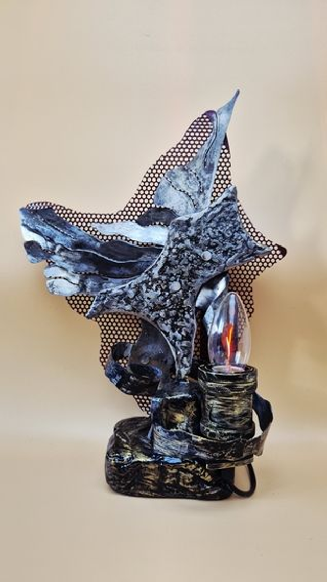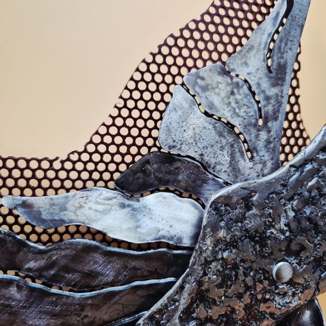 - Structure et Formes : L'œuvre s'élève verticalement sur une base sombre et texturée, d'où jaillit une forme métallique centrale asymétrique. Cette pièce maîtresse, au fini moucheté gris et noir, évoque une aile d'ange déchue ou un fragment de roche volcanique en suspension.