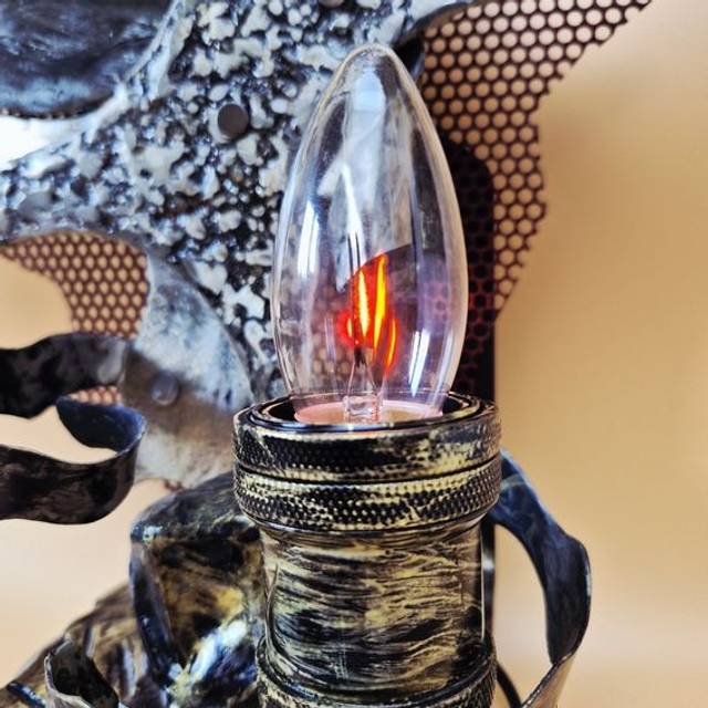 - Le Luminaire : Sur le côté de la base, une petite lampe "bougie" est enchâssée dans un réceptacle brossé d'or. Sa flamme de verre effilée diffuse une lueur orangée chaleureuse qui contraste avec la froideur apparente du métal, transformant l'objet en un sanctuaire moderne ou un autel technologique.