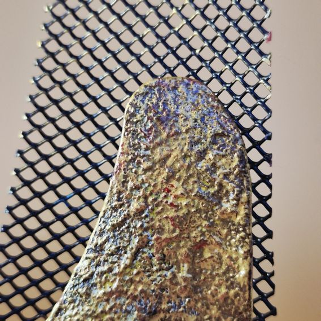 - Arrière-plan : Une grille métallique perforée et souple sert de toile de fond, agissant comme un voile ou une aura géométrique qui capte les ombres projetées par les autres éléments.