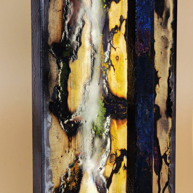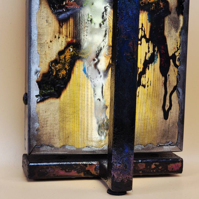 Cette œuvre murale ou de table est une véritable exploration de l'énergie capturée, utilisant la technique des figures de Lichtenberg pour créer des motifs arborescents qui rappellent la foudre pétrifiée dans le bois. Le panneau central, parcouru par ces brûlures électriques naturelles, est sublimé par un éclairage indirect qui filtre à travers les interstices, révélant des nuances ambrées et dorées. Une structure métallique verticale vient sceller l'ensemble, apportant une rigueur industrielle qui contraste avec l'aspect organique et sauvage du bois calciné. Le cadre en métal, aux soudures apparentes, souligne le caractère brut et artistique de cette pièce, où la lumière émane du cœur.