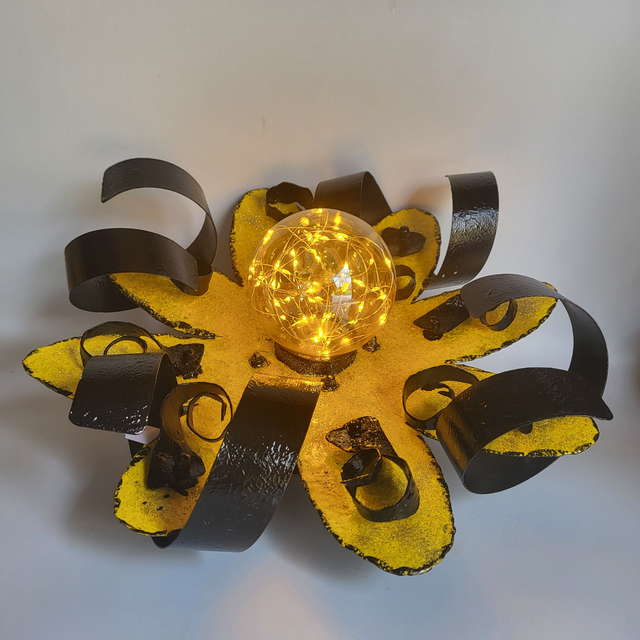 Ce luminaire présente un design floral et artistique, évoquant une fleur éclose. Sa structure est composée de pétales métalliques noirs et jaunes, avec une finition texturée et patinée qui lui confère un aspect vieilli ou rustique. Au centre, une sphère transparente est remplie de nombreuses petites lumières LED, créant un effet scintillant et chaleureux. Le contraste entre le métal sombre et le jaune vif, combiné à l'éclat des LED, en fait une pièce décorative lumineuse.