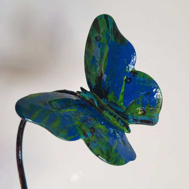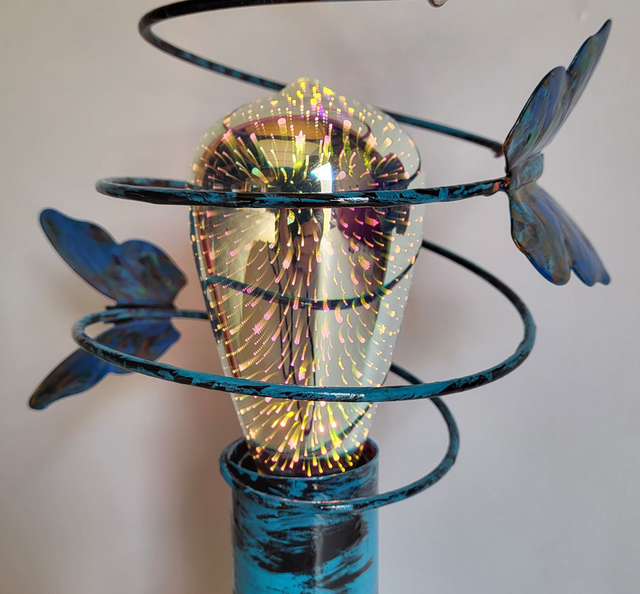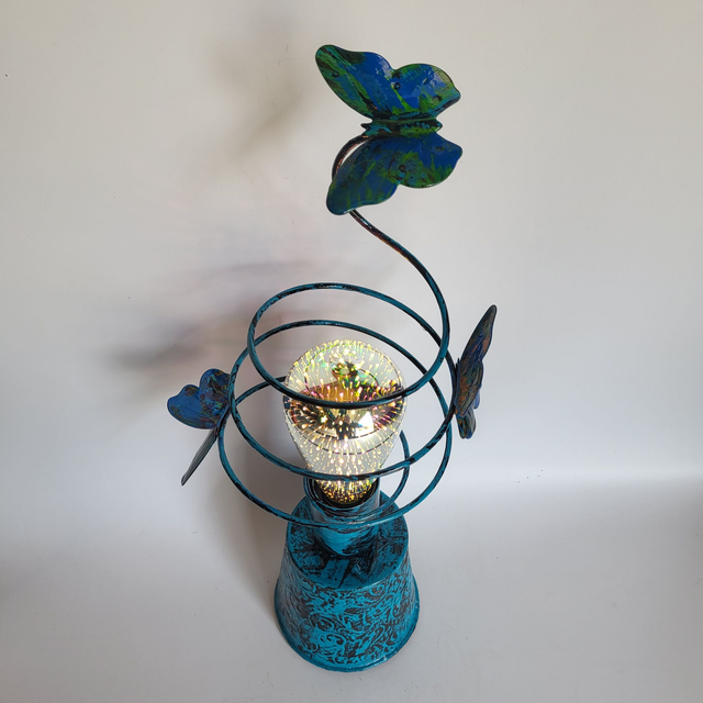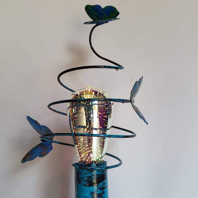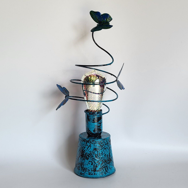 Ce luminaire est une lampe décorative unique avec une base bleue ornée, un ressort en spirale métallique, une ampoule centrale, et des papillons métalliques bleus. Il combine des éléments industriels et organiques pour créer une pièce d'éclairage artistique.