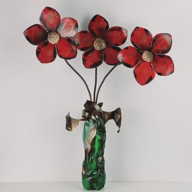 Trois fleurs rouges aux cœurs dorés, fixées par un lien de fer dans un pot en béton fibré vert à l'aspect organique.