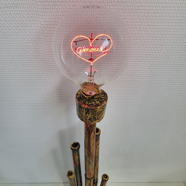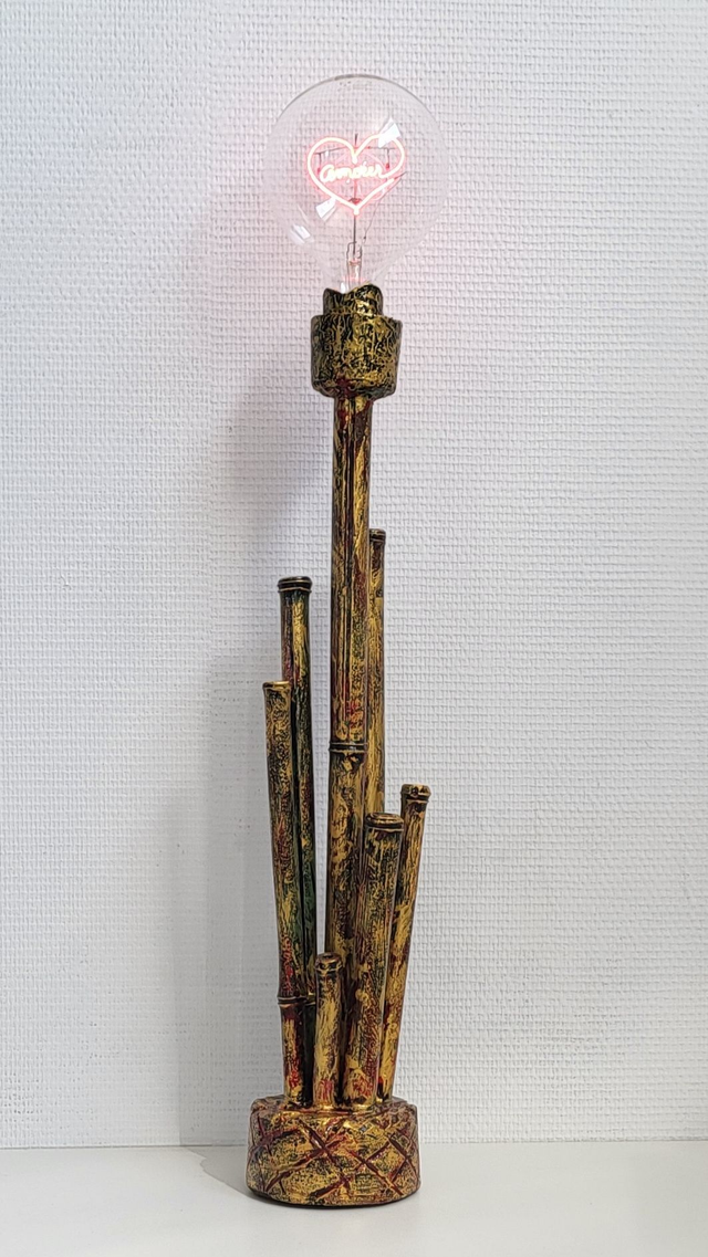 Ce luminaire présente une esthétique à la fois naturelle et romantique, évoquant un bouquet de tiges de bambou de différentes hauteurs, traitées avec une patine dorée et des nuances de vert ou de brun pour un effet vieilli et texturé. Les détails des nœuds du bambou sont apparents, renforçant l'illusion. Au sommet de cette structure s'élève une douille assortie, accueillant une ampoule transparente dont le filament lumineux dessine un cœur rougeoyant, ajoutant une touche douce et originale. L'ensemble repose sur une base ronde et stable, reprenant les mêmes finitions dorées et texturées. Ce luminaire constitue ainsi un objet décoratif chaleureux et singulier, capable de créer une ambiance particulière grâce à sa lumière douce et sa forme expressive.