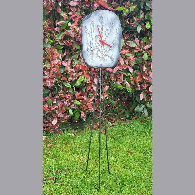La pendule est un objet décoratif d'extérieur. Son cadran a une forme organique et irrégulière, avec une surface gris argenté texturée technique Lichtenberg. Des motifs abstraits plus foncés, évoquant des veines, sont visibles sur le cadran. Les aiguilles de l'horloge sont fines et de couleur rouge vif, créant un contraste saisissant avec le fond. La pendule repose sur un trépied noir aux pieds fins et écartés.