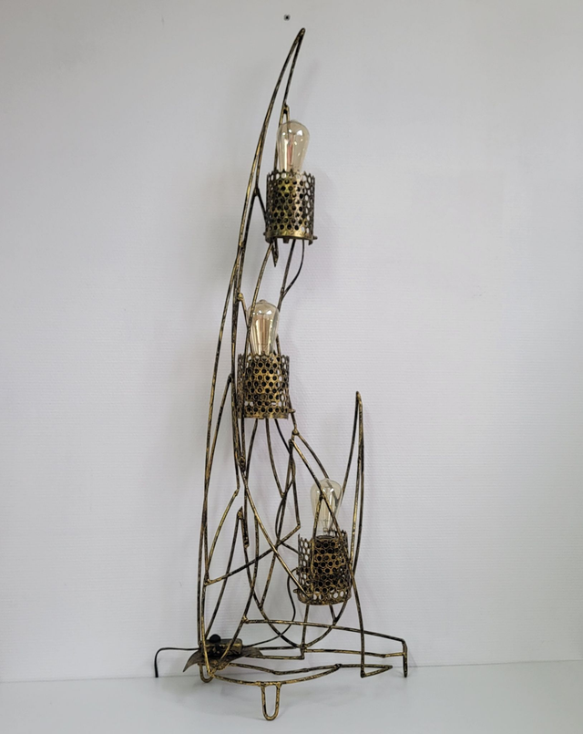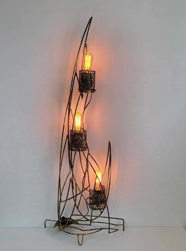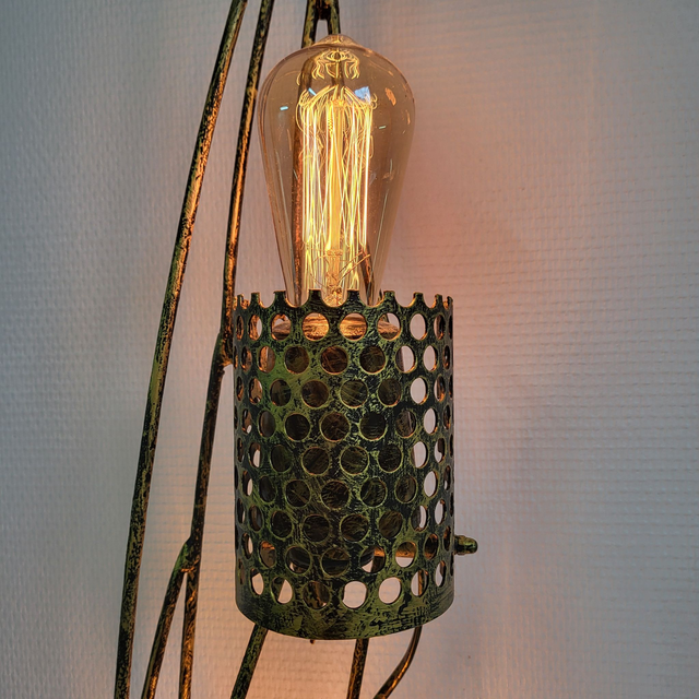 L'éclairage : La structure accueille trois ampoules à filament de type Edison, diffusant une lumière chaude et ambrée. Chaque ampoule est nichée dans un réceptacle cylindrique en métal perforé (grillage industriel), créant des jeux d'ombres et de lumière complexes une fois allumé.