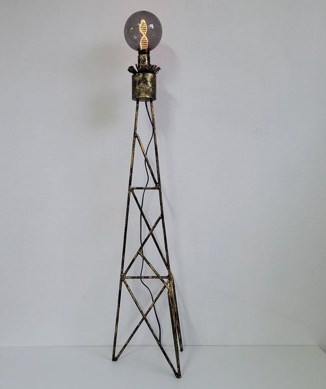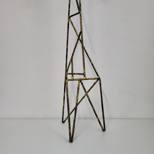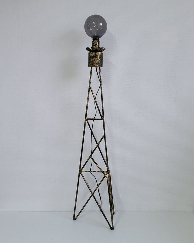 - a Structure : Ce luminaire contemporain se dresse sur un haut piétement en métal de style tour de transmission ou échafaudage d'art, offrant une allure aérienne et industrielle. Sa silhouette pyramidale apporte une grande stabilité visuelle tout en restant légère.